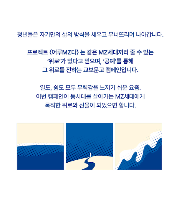 교보문고와 무형유산 브랜딩 에이전시 프롬히어와 진행한 이 캠페인은 공예라는 매개체를 통해 동시대 청년들에게 선물과 같은 순간을 제안합니다. 차분하면서도 깊이 있는 블루 컬러와 유연하게 흐르는 곡선 형태를 디자인 모티프로 활용하여, 무력감을 느끼는 청년들의 삶 속에 잔잔하게 퍼지는 위로의 파동을 표현했습니다.