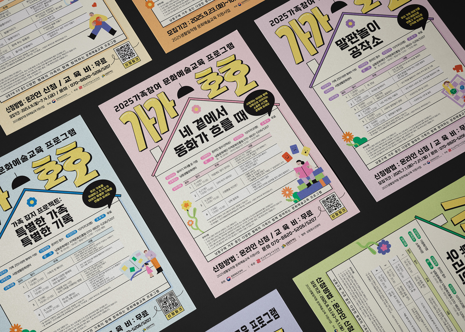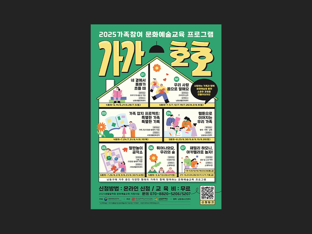 ‘가가호호’는 다양한 가족 구성원이 문화예술 활동을 통해 소통하며 유대감을 쌓는 가족 친화형 문화예술교육 지원사업입니다. 세대 간의 공감과 힐링을 주제로 한 7가지 다채로운 프로그램을 포괄하여, 가족의 따뜻한 연결과 화합의 가치를 시각적으로 표현했습니다.